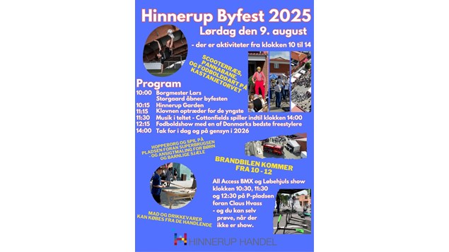 Hinnerup Byfest 2025 arrangeres af Hinnerup Handel, som inviterer alle til at komme og opleve byens stærke fællesskab i en uformel og festlig atmosfære.