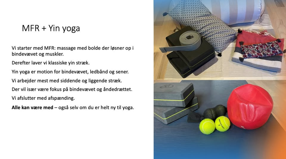 Det skal du medbringeFor at få den bedst mulige oplevelse anbefales det, at du har lunt tøj på, som du kan bevæge dig frit i. Til sessionen skal der bruges en yogamåtte, to klodser, et bælte, en aflang pude eller lignende, to tæpper, fire tennisbolde, en strømpe, en lille fitnessbold og en eventuel øjenpude til afspænding.